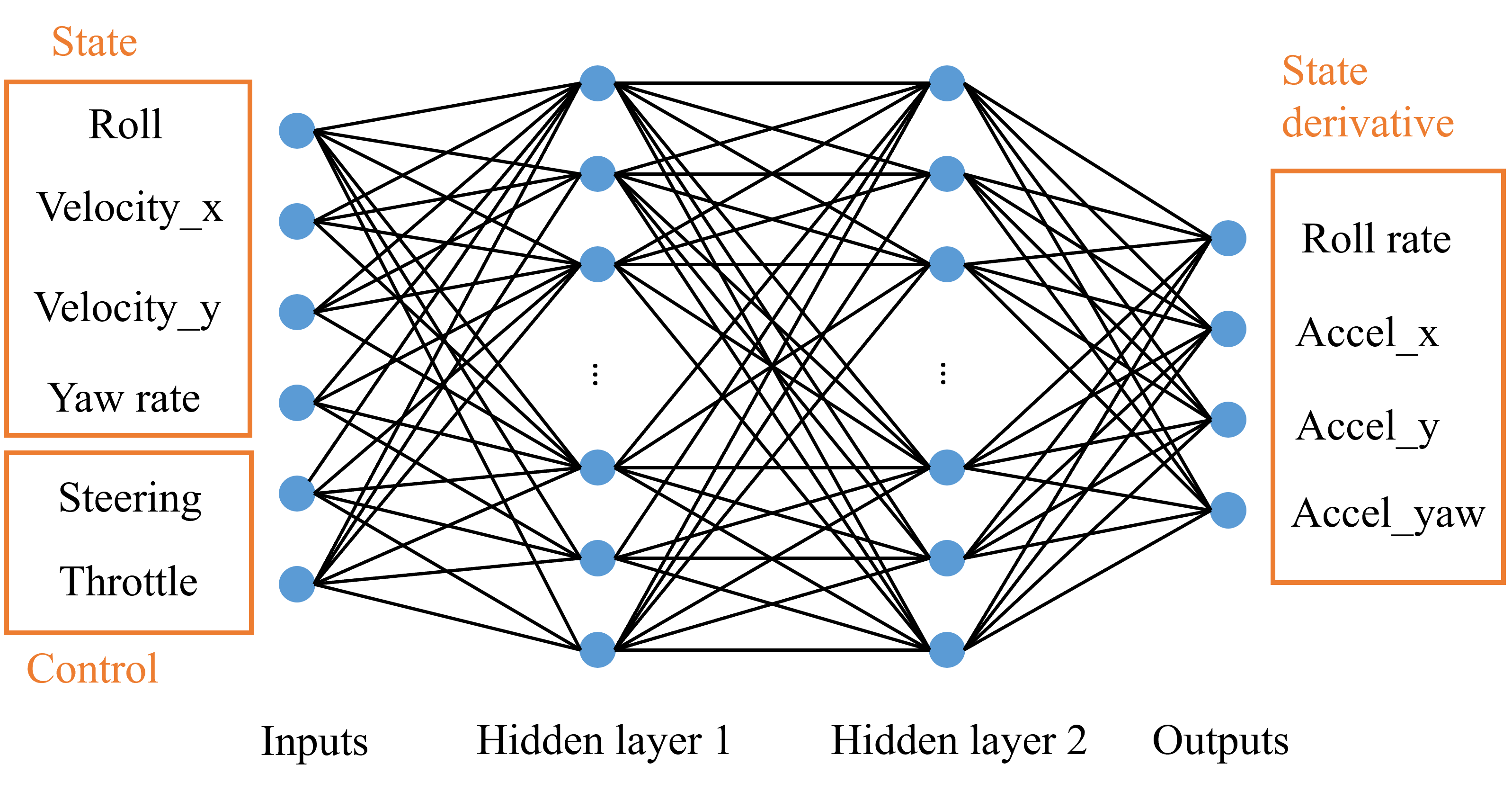 It’s hard to measure or estimate the parameters of a high-fidelity vehicle model. We follow the same modeling process in AutoRally, a fully connected neural network to represent the vehicle dynamics.