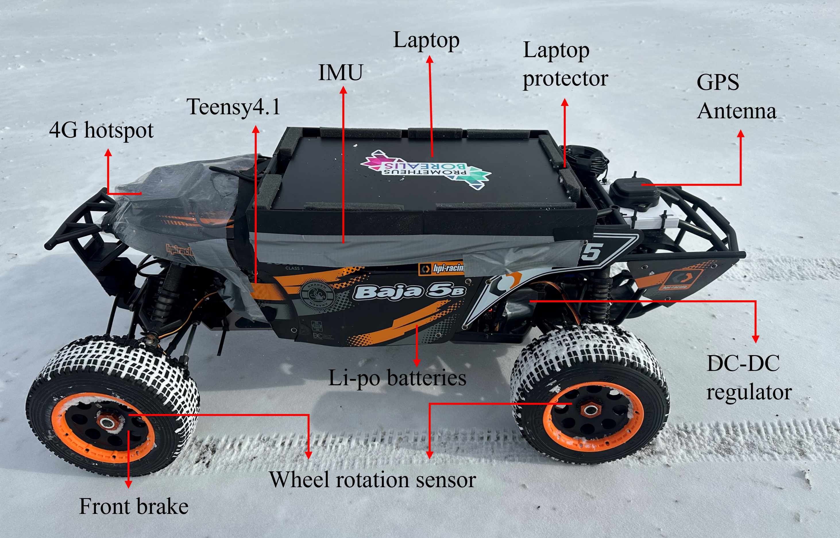 It’s built based on a 1:5 scale Baja 5B RC car. Ublox c099-F9P GPS and Lord 3DM-GX3-25 IMU are selected for localization. The GPS Antenna is located on a 3D-printed support bracket at the rear of the car so as not to be obscured by other parts. The IMU is mounted on rubber bumpers on a sturdy metal plate inside the middle of the car. To get an RTK GPS signal, a 4G hotspot is attached to the front of the shell, Real Time Correction Messages (RTCM) can be received to enable RTK measurement.