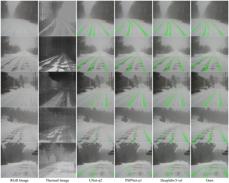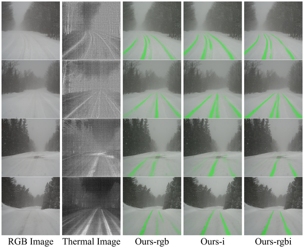 We present a wheel track detection system that leverages RGB-Thermal (RGB-T) imaging, where thermal channels reveal critical temperature differentials between compacted tracks and loose snow - tracks exhibit higher thermal inertia and lower reflectivity, emitting stronger radiation signatures even in visually homogeneous conditions. By fusing these distinctive thermal patterns with RGB spatial information, our method reliably identifies navigable tracks, enabling robust path-following in complete white-out conditions where snow textures and terrain features become indistinguishable.