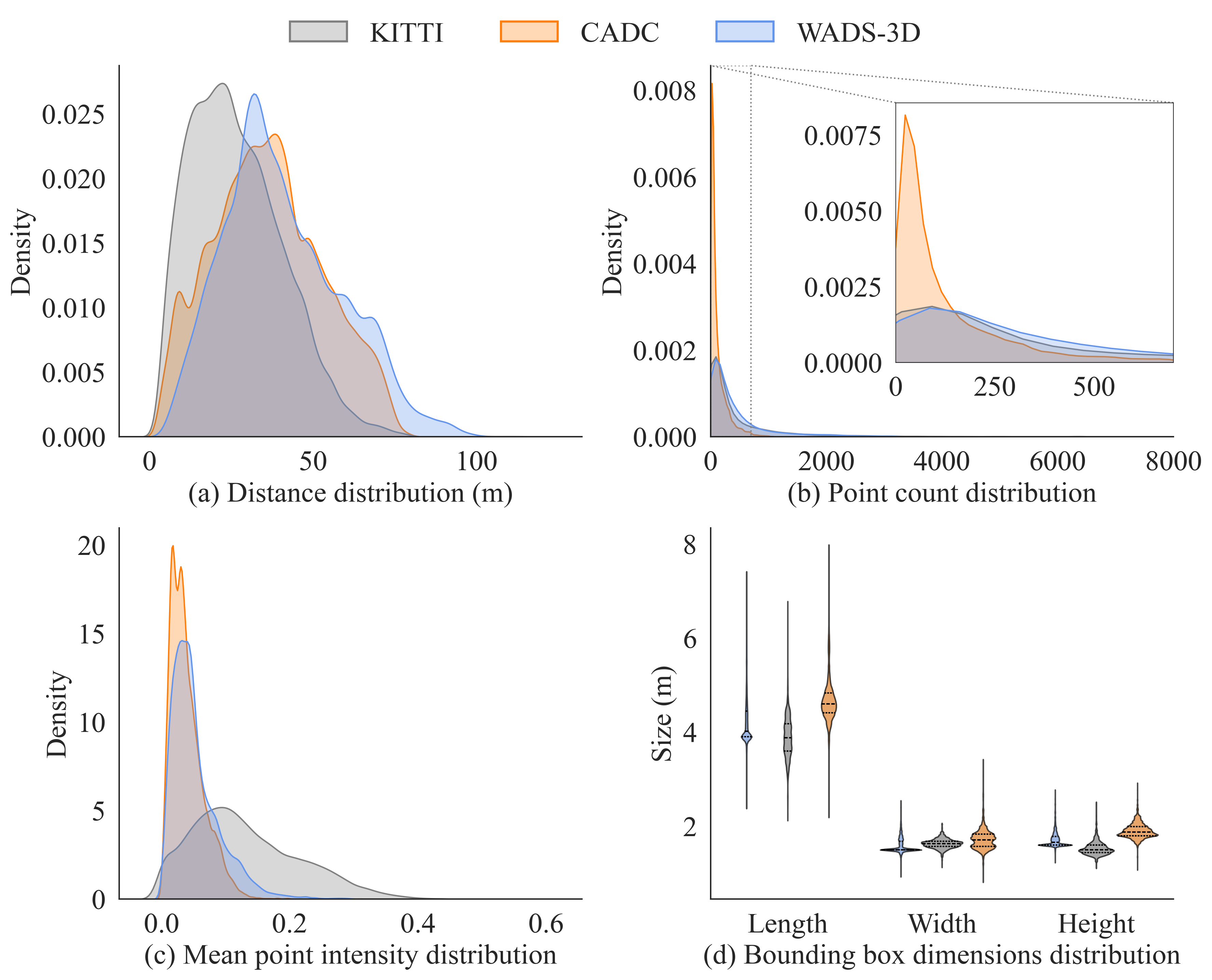 To facilitate research on 3D object detection in adverse weather, we introduce the WADS-3D dataset. Following the standard KITTI format, the dataset comprises 4,100 labeled frames, which were generated by rotating 2,050 unique 360-degree labeled scans to effectively double the dataset size while adhering to KITTIās forward-view requirements. It contains 30,104 labeled cars, focusing exclusively on this class due to the scarcity of pedestrians and cyclists in the collected snowy scenes.
